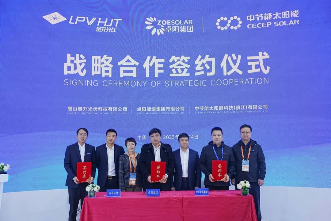 琏升光伏与中节能太阳能、卓阳能源签署三方合作协议。琏升光伏总经理唐旋、中节能太阳能销售总监曹义敏、卓阳能源副总经理腾茂祥,上台签约。眉山市丹棱县县委书记郭红、琏升光伏董事长王新、中节能太阳能总经理黄国平、卓阳能源董事长黄俊共同见证。中节能太阳能股份有限公司,作为国内第一家以太阳能发电为主业的上市公司,始终坚持质量第一、技术领先、效益优先理念,此次与琏升光伏签约电池片采购协议,是对琏升第三代高效异质结电池的充分认可。卓阳能源致力于为客户提供领先的绿色能源整体解决方案,此次签约采购中节能组件,三方合作,通过资源共享优势互补,将进一步扩大琏升光伏异质结电池产品的市场占有量和认知度。