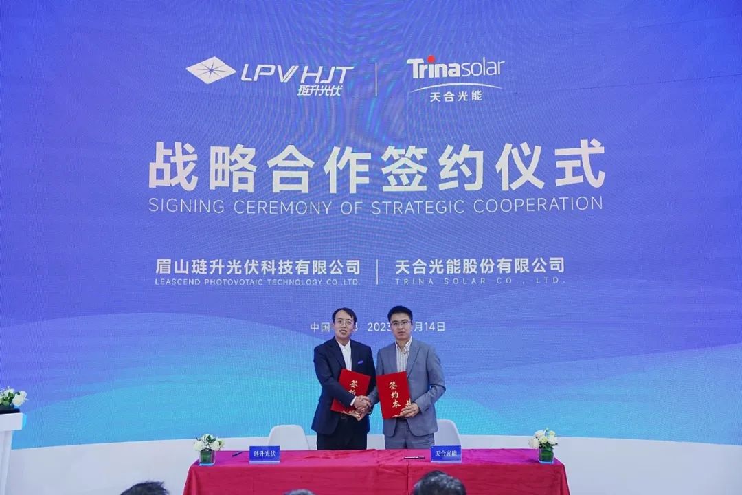 琏升光伏与天合光能股份有限公司签署战略合作框架协议。琏升光伏总经理唐旋,天合光能区域总刘强上台签约。天合光能作为全球领先的光伏智慧能源整体解决方案提供商,实力雄厚,技术卓著,此次与琏升光伏在新能源发展理念上彼此契合,达成框架协议,未来合作空间广泛。对于琏升而言很高兴有此机会与天合光能携手未来,对琏升光伏践行高质量发展意义深远,影响重大。