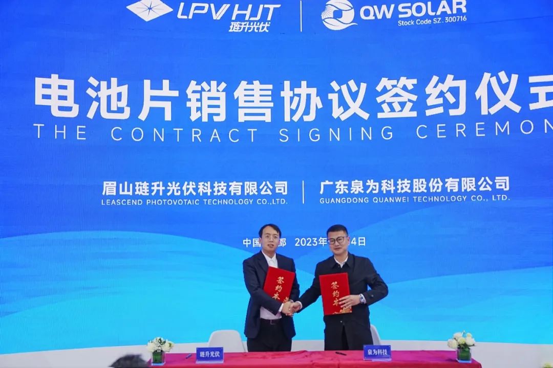 琏升光伏与山东泉为新能源科技有限公司签署电池销售合同框架协议。琏升光伏总经理唐旋、泉为新能源采购总监沈俊杰上台签约。泉为新能源致力于推动全球清洁能源的发展,琏升光伏与泉为新能源达成电池供货合作,根据协议,泉为将在未来向琏升光伏采购异质结电池产品,琏升光伏将在订单交付、产品质量和售后服务方面全力把关。此次双方签约合作,充分表明泉为新能源对琏升光伏HJT第三代晶硅高效电池的认可以及对异质结未来前景充满信心。